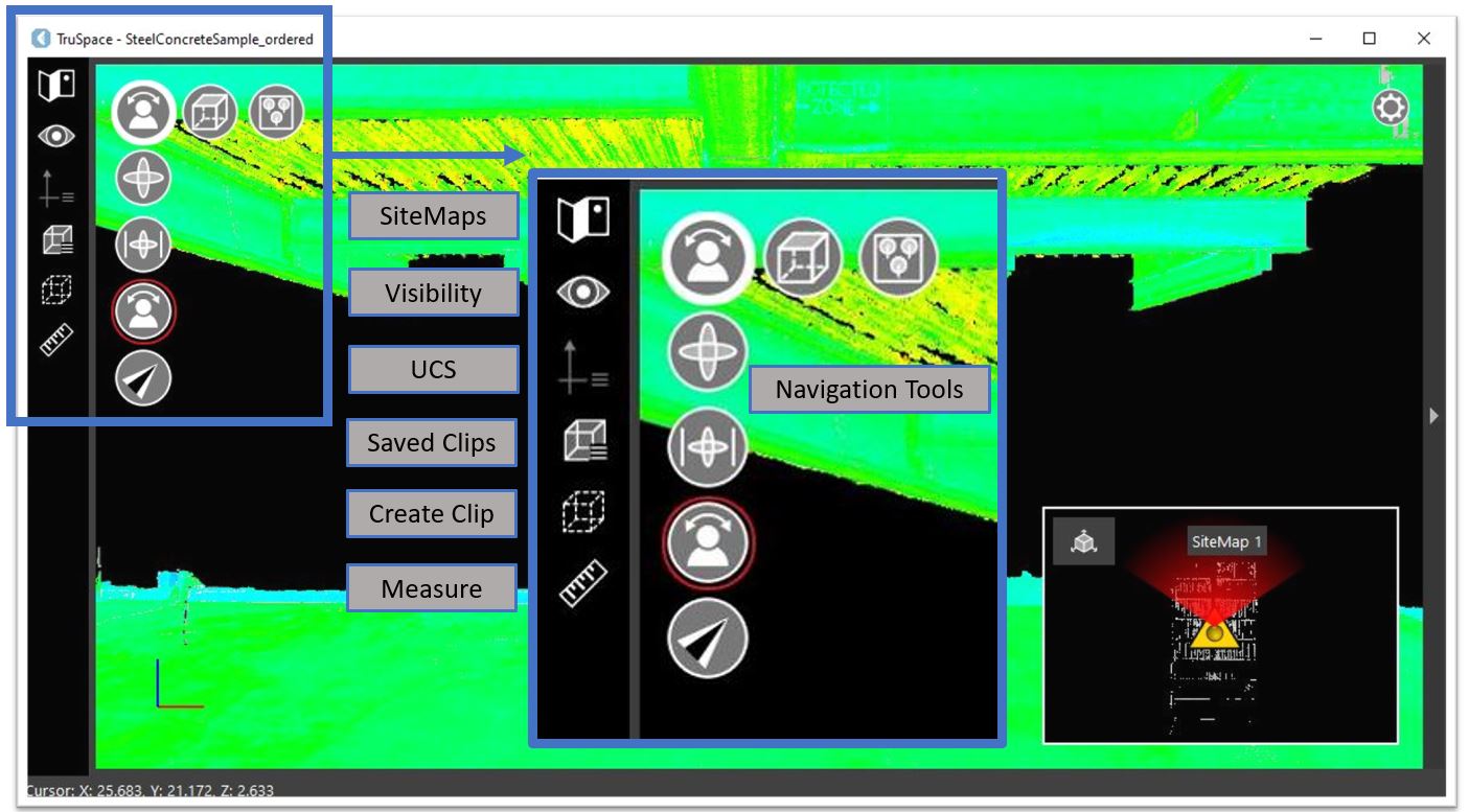 The primary tools are located on the left-hand side of the application. The navigation tools are located in the upper left-hand corner of the main viewing window.