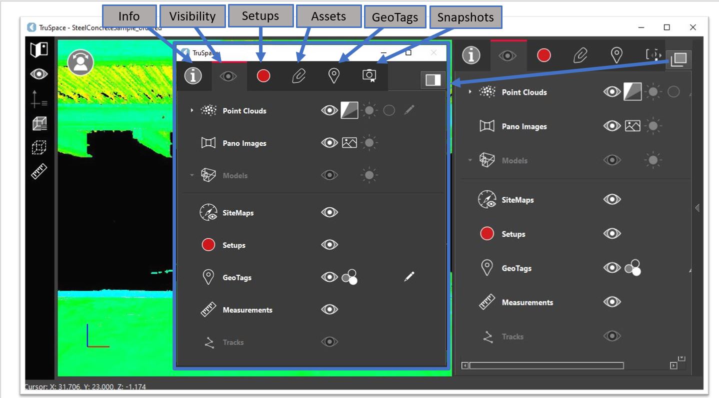 TruSpace includes a collection of panels on the right-hand side of the application, providing various functions and information related to the project: