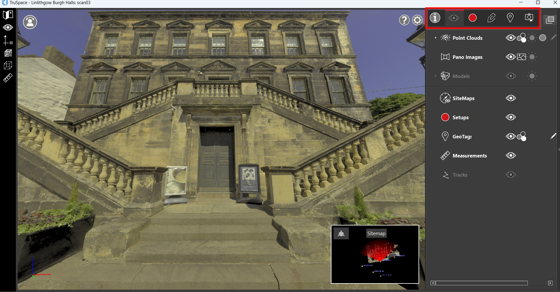TruSpace contains a set of panels on the right-hand side of the viewer, providing various tools and information related to the project. They are as follows:
