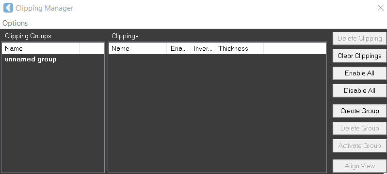 The left pane is the list of clipping groups. A clipping group is a list of clipping records that are applied together to point clouds. The user can create, delete, or activate a group. At any time, there is one group activated. When activated, the clipping records are displayed in the Clippings pane where the user can enable or disable a clipping record, invert a section view clipping or a fence clipping.