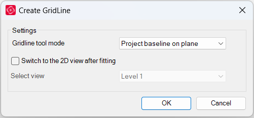 Select the Switch to the 2D view after fitting check box if you want to switch to a 2D view after the gridline is created.