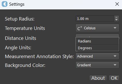 The Angle Units setting allows users to change the angular units for the viewer. Measurements and markups will update accordingly when this setting is changed.