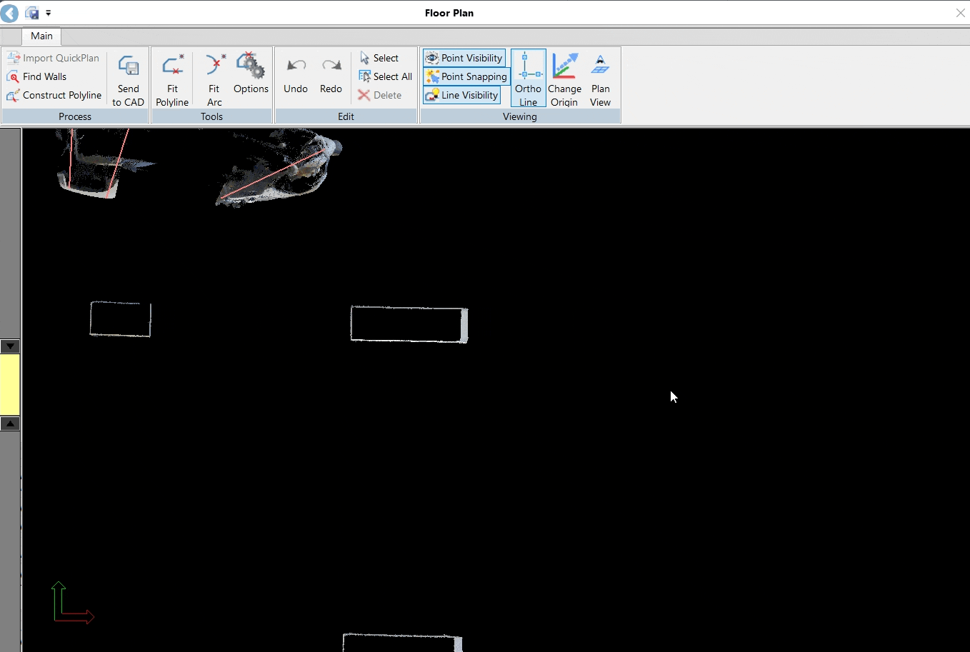 Click Import QuickPlan in the Process panel to import a QuickPlan DXF file created in Cyclone FIELD 360. The imported lines can then be edited and adjusted to create a floor plan.