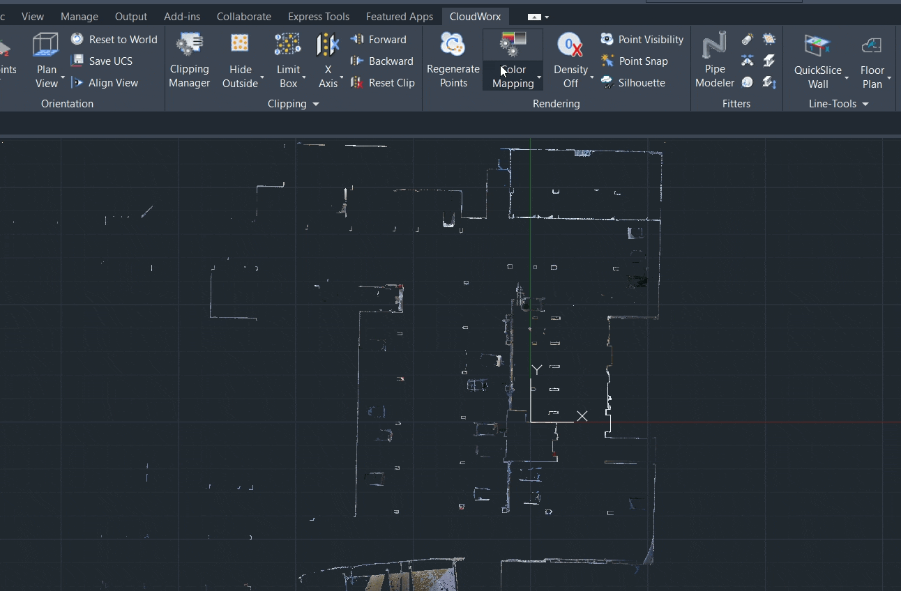 4.2. Select 2 points on the point cloud to align the UCS axes to the building. The first pick point defines the origin of the new UCS, and the second pick point defines the direction of the X-axis; the direction of the Z-axis (up direction) is not changed.