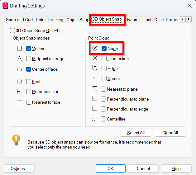 2.2. In the Drafting Settings dialog, go to the 3D Object Snap tab and ensure Node is selected in the Point Cloud settings. It is the minimum required to select objects in the point cloud.