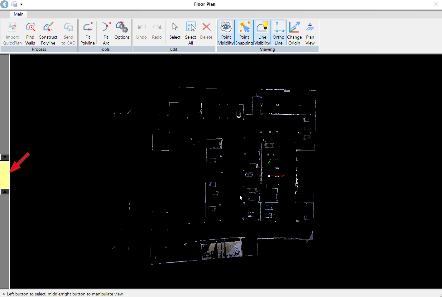 To speed up processing of point cloud data, it can be helpful to temporarily hide unnecessary points. By eliminating specific portions of data, you can focus on the area of interest and avoid unintentionally selecting points outside of it. Additionally, setting up a quick slice is essential before utilizing the polyline tools available in the Floor Plan tool. See QuickSlice for more details.
