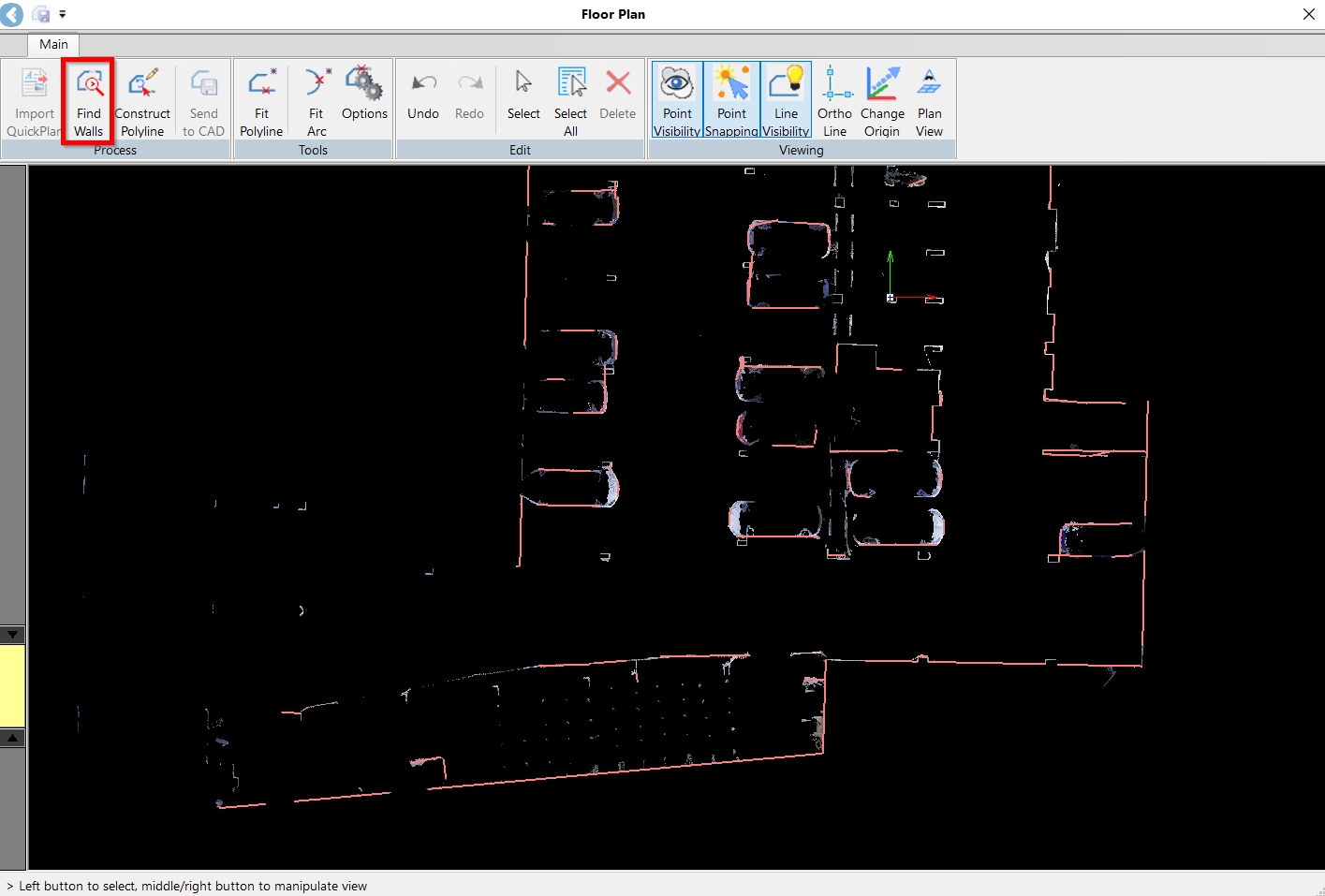 If QuickPlan is unavailable, in the Process panel, click Find Walls to automatically extract wall lines. The Floor Plan tool will identify all possible line segments and display them as red lines.