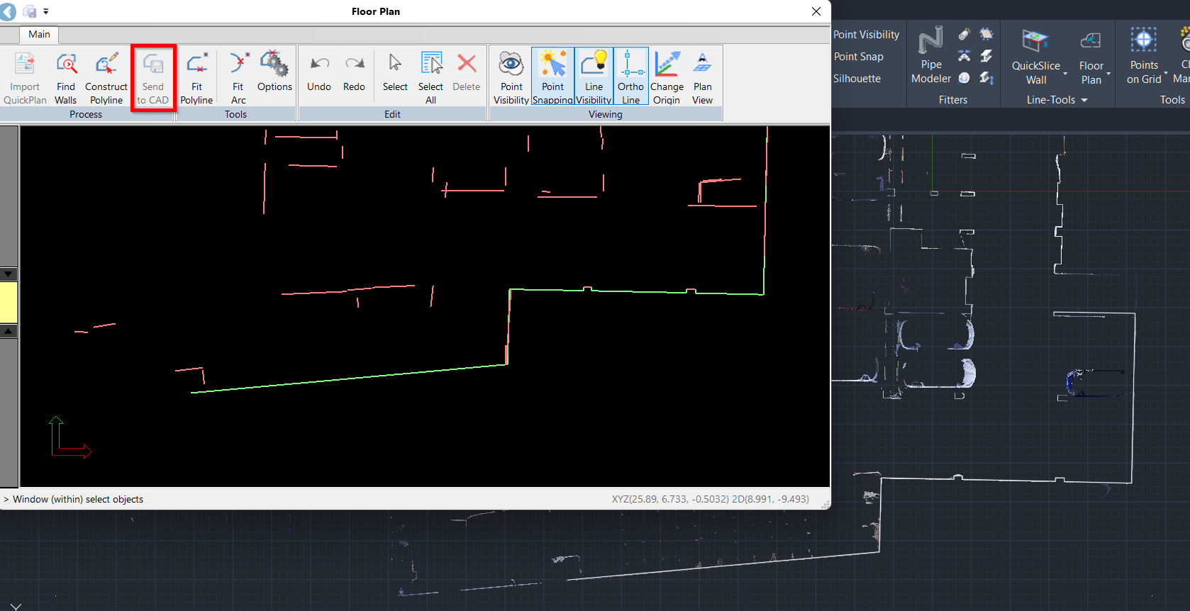 12.2. Once you are happy with the result, click the Send to CAD button in the Process panel. The green (approved) line will disappear from the Floor Plan tool and appear as a solid white line in the CAD window.