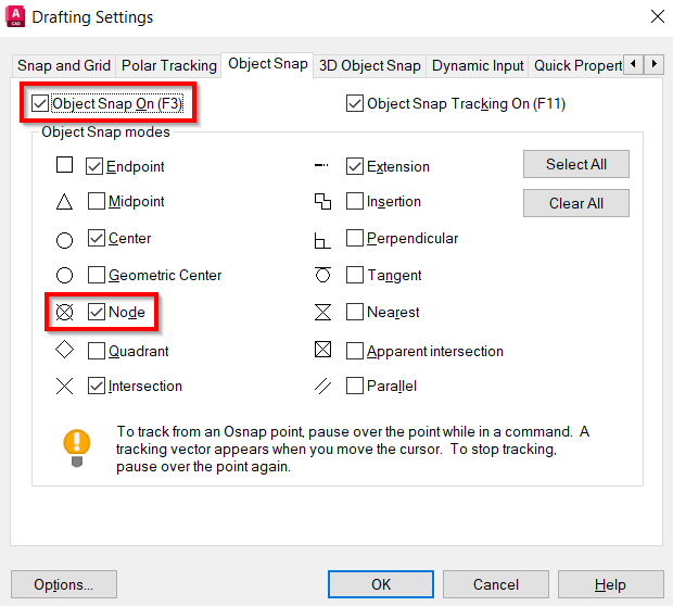 1. Ensure the Object Snap is enabled and the Node type is selected, using the OSNAP command: