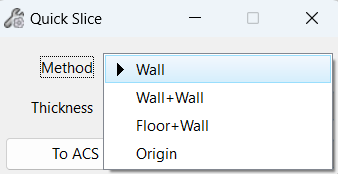 This tool enables the creation of a horizontal slice from a single pick point. The resulting slice will have a UCS where the X-axis will be aligned along the wall to the right.