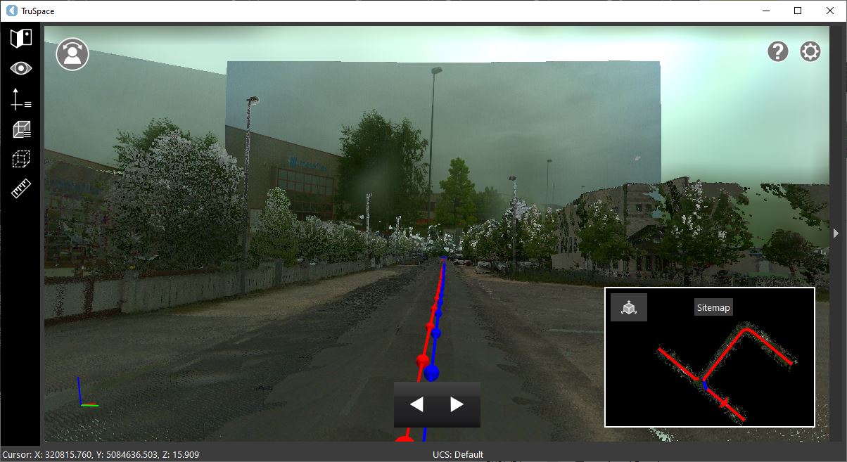 At this point, the user will be able to navigate along the trajectory. The navigation mode will be set to Panoramic, providing a similar experience to being at a Setup location. The mouse scroll wheel can be used to zoom in and out on images.