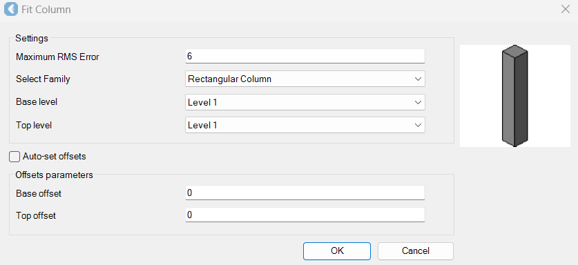 Specify the base and top levels to define the lower and upper planes where the column should be placed.