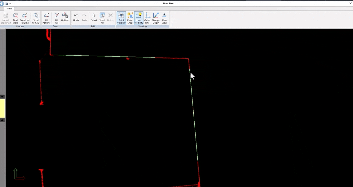 Click Import QuickPlan in the Process panel to import a QuickPlan DXF file created in Cyclone FIELD 360. The imported lines can then be edited and adjusted to create a floor plan.