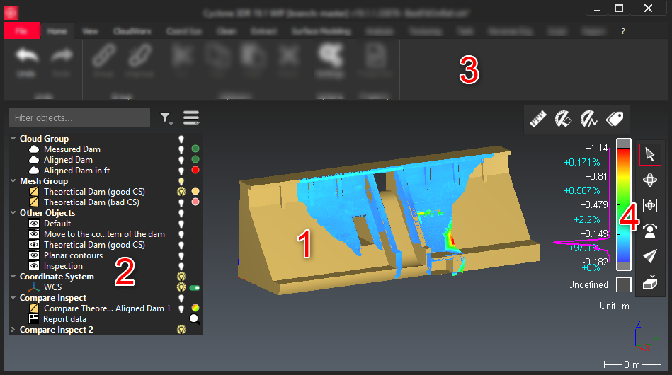 The tree (or explorer): to see and interact with the objects (clouds, meshes, polylines, etc.) which are in the current project. Read Tree view.