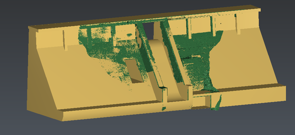 Once the two objects are in the same coordinate system, we can see clearly that the cloud contains some parts that are not present on the model. These zones must be removed because they influence the best fit in a wrong way.