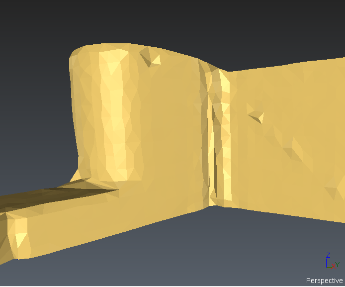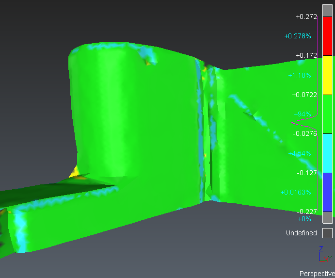 For some objects, it is important to understand the concept of the normal orientation to understand the representation. The normal of an object is the "outside" of this object. The “outside" is the side from where the object is scanned/viewed. At the opposite, the "inside" means inside the material itself. For instance, the orientation of meshes or surfaces is very important for inspection. In the software, meshes and surfaces have a color for the “inside” and another one for the “outside”, so it is very easy to detect when the normal is not correctly oriented. The “outside” color is also shinier than the “inside” color.