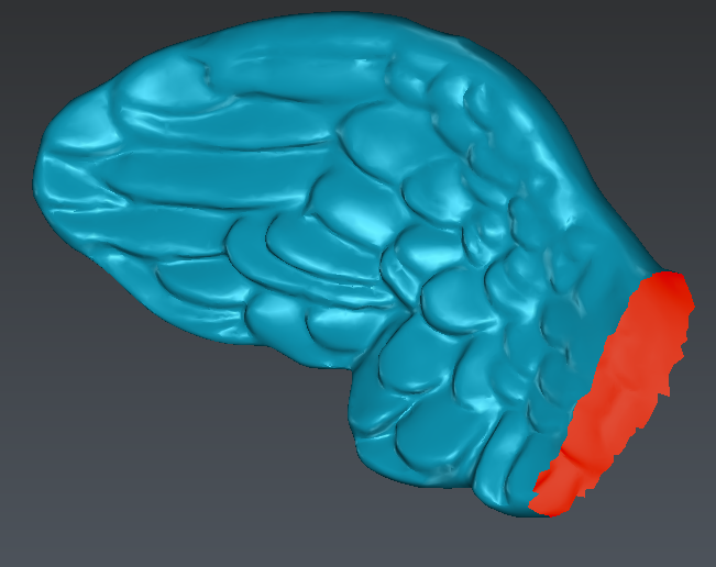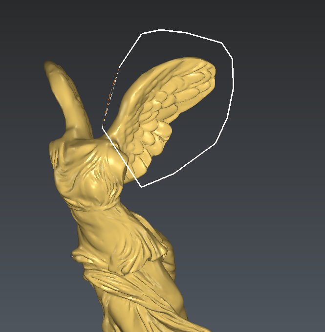 Select through means that we will select all triangles inside the polygon, even the hidden ones. Set the view in order to see the entire wing and draw a polygon around it (as in the following picture).