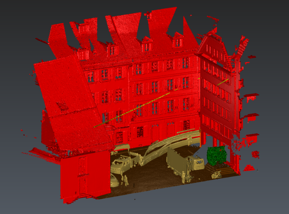 The file contains the point cloud of a part of a city, with building frontages, vehicles and people. We will use manual classification tools to classify the points.