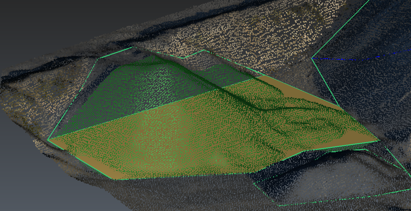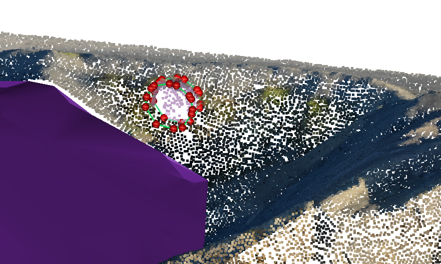 For this stockpile 4, you have to proceed in 2 steps by computing first the main part 4a above the ground, and then create another stockpile 4b corresponding to the part above the embankment. In both cases you should start drawing the contour by clicking points corresponding to the border between parts, that is to say points corresponding to the low and invisible embankment edge. Choose the From contour points method to compute the 2 parts. Note the gap size between both parts depends on the cloud resolution.