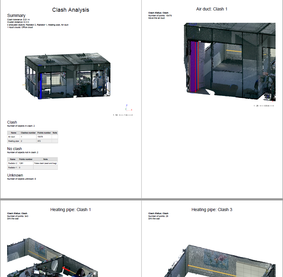 The second page lists all the object with the status clash and unknown. You should have 3 different clashes now, as displayed in the top left corner. Use the red arrows to navigate between clashes. Each clash has its page, which is composed of the object name and the clash number in the title, the clash status, the number of clash points, the note you wrote and a general view of the clash.