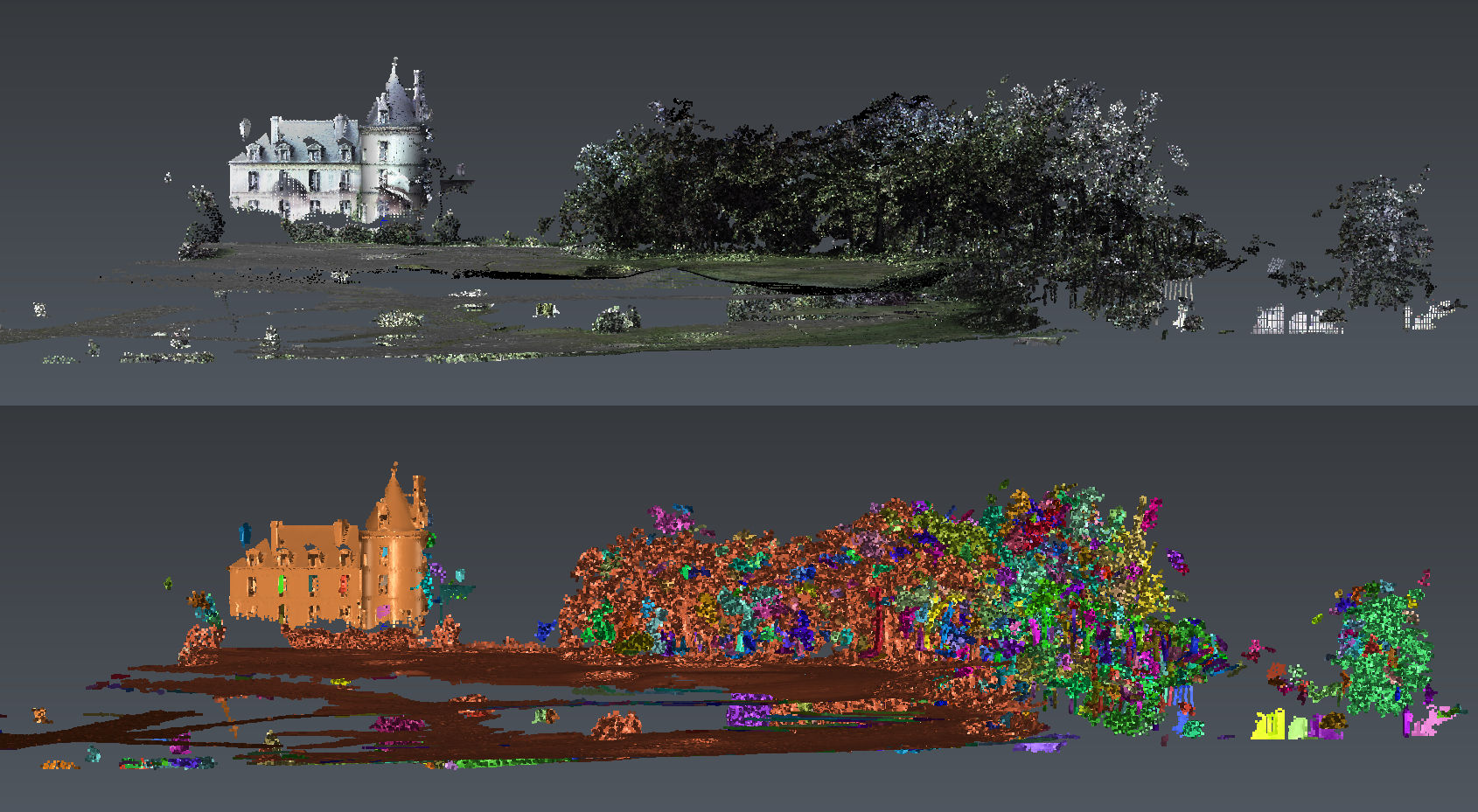 It is also possible to automatically separate a cloud according to an object extracted or created beforehand (a polyline, a geometrical shape or a mesh). This possibility is not detailed in this exercise.