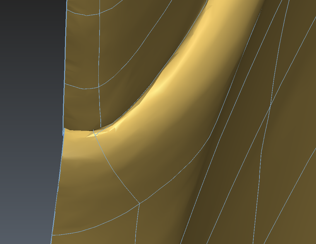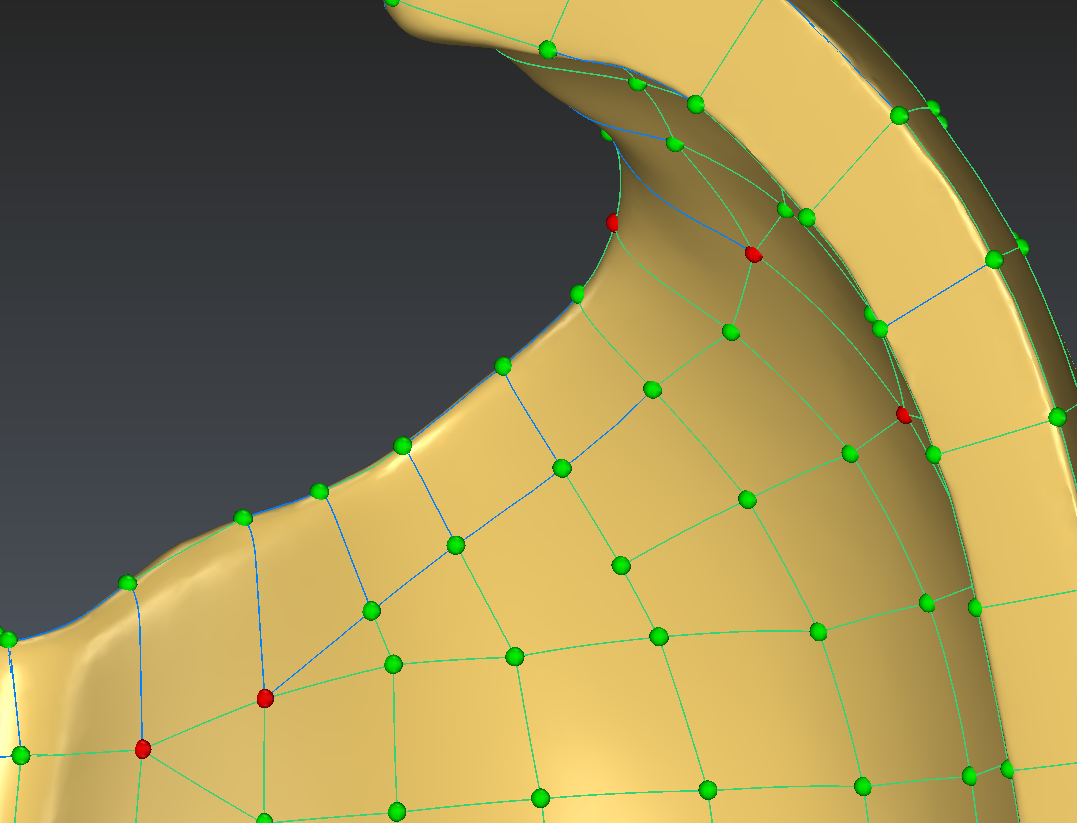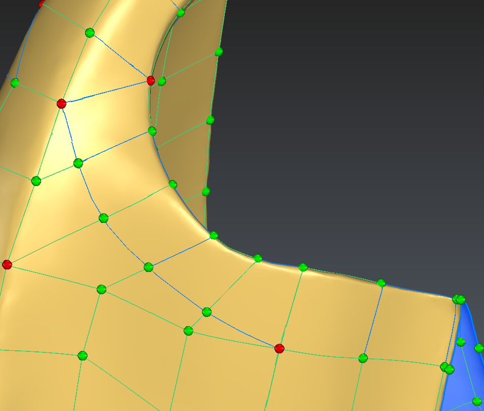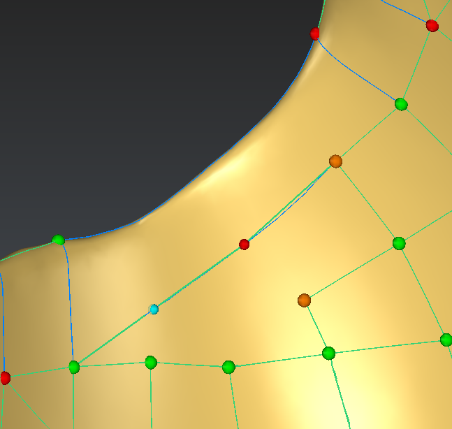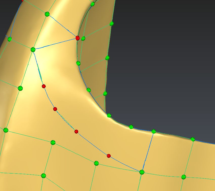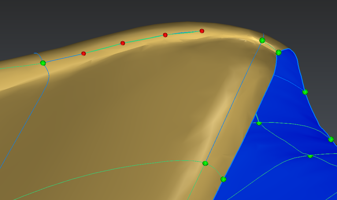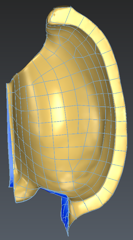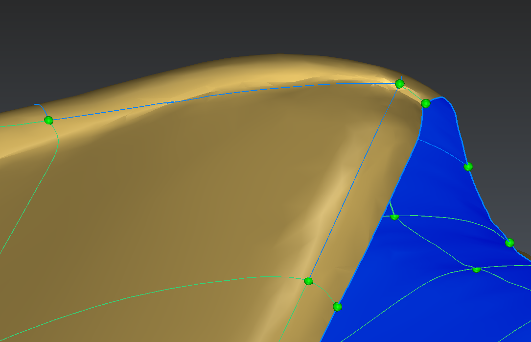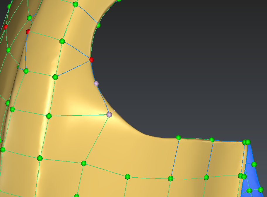 The edge shown in blue in the image below is also not following very precisely the thin area. We will delete it and recreate so that it follows the edge of the part: