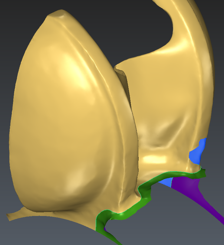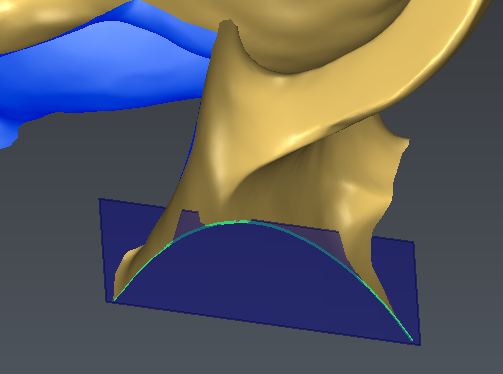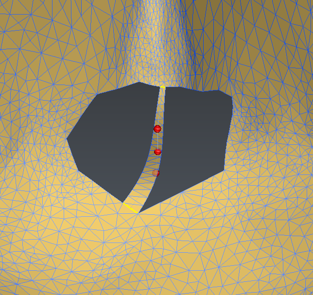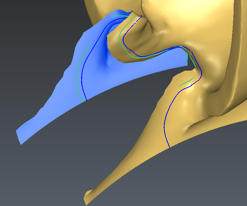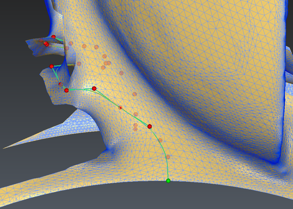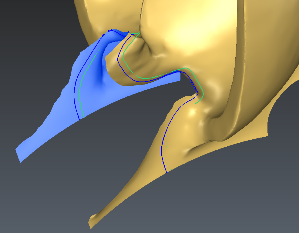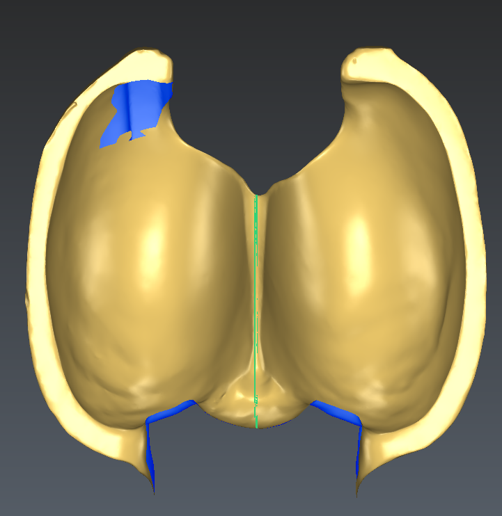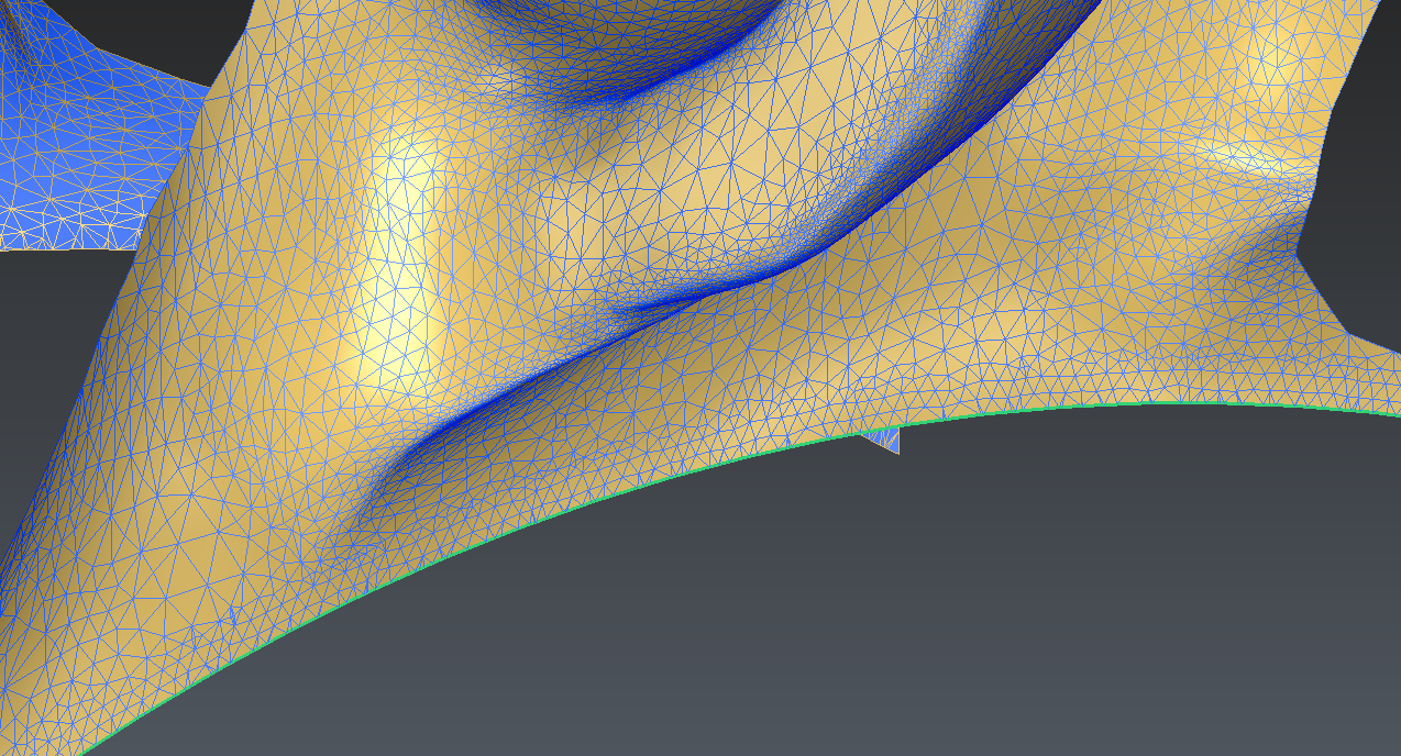 Depending on the curve drawn on the back of the blade, it might happen that the algorithm picks the wrong side of the mesh to clean (2nd image below). In this case, it is necessary to manually delete some triangles in front of the blade with the command Clean / Separate Mesh.