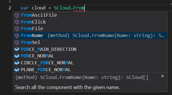 In order to benefit from documentation and code completion inside VSCode, you will have to provide the path to the description file (.d.ts) containing the description of the script API. The description file is located into the installation folder.