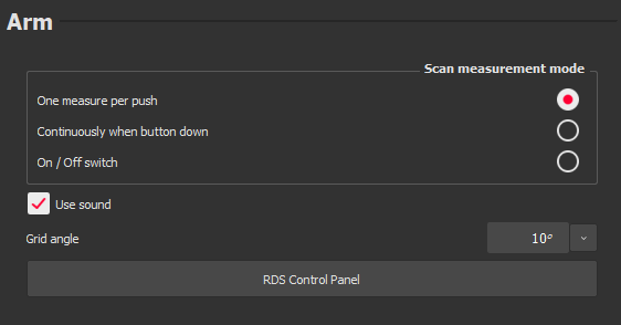Launch the settings page Arm Settings in order to adjust the arm settings before scanning points. The software automatically detects if the measurement device is in probe mode or scanner mode. When it is on scanner mode, the following parameters can be managed.