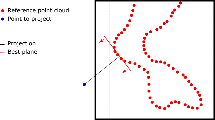 Each point is projected in the direction of the local normal of the cloud on a local plane. In other words, the "distance" is not the closest distance to a point of the target cloud, but the closest distance to a local plane of the target cloud. According to the different options, this local plane is selected as detailed below: