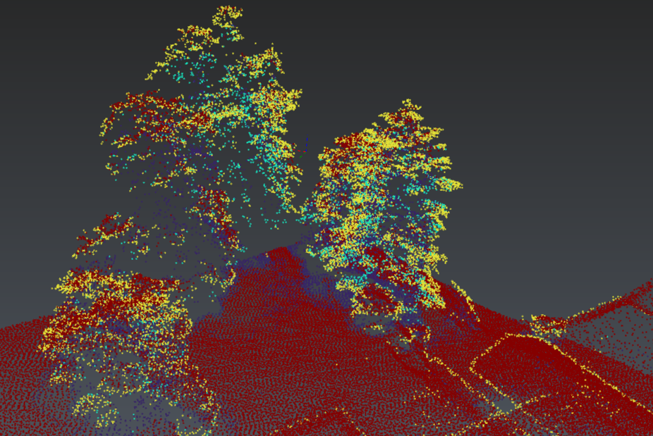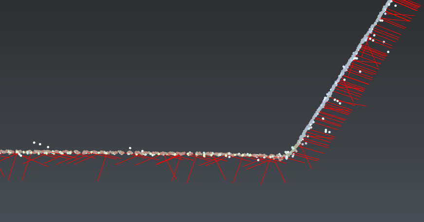The scanning directions are displayed using small red lines added to some points (from the measured point to the device). This is available on any point cloud when the scanning directions are known. It is suitable to see the beam incidence angle and is used to orient the estimated normal of the point. Scanning directions and normals are often confused: normals are perpendicular directions to a surface which is estimated when dealing about a point cloud (you can use Align To Surface to see the normal of the hovered point). Note that wrong scanning directions will misorient normals which could lead to wrong mesh orientation (please read Exercise: Understand meshes orientation) or may affect the rendering (shading).