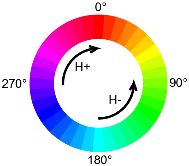 HSL (Hue Saturation Lightness): in that case, you have to define a gradient direction on the wheel below. Hue increases clockwisely (CW) and decreases counterclockwisely (CCW). There is also a Shortest (minimum ΔH) or a Longest (maximum ΔH) way on the wheel.