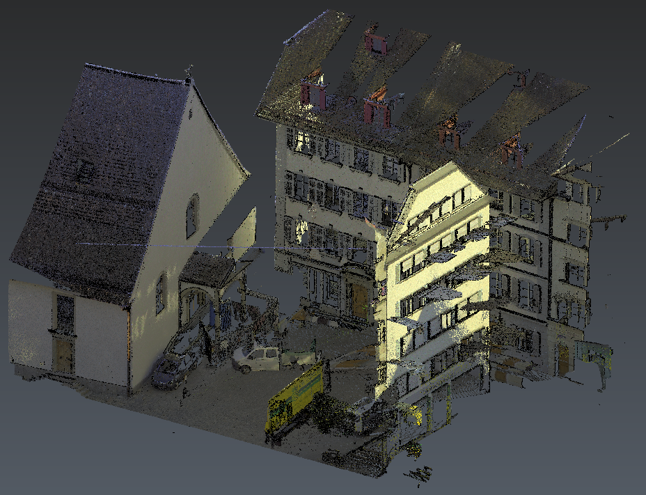 The file contains the point cloud of a part of a city, with building frontages, vehicles and people. We will use manual classification tools to classify the points.