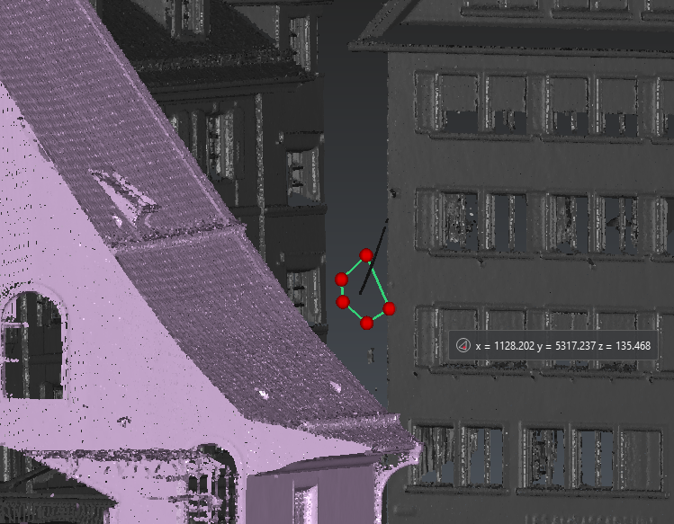 To help in the classification, you can temporarily switch the representation of the Created, Never classified points to Real Color by clicking on the disk icon.Select the road sign, also next to the right building. There is no default class for it: let's make one.