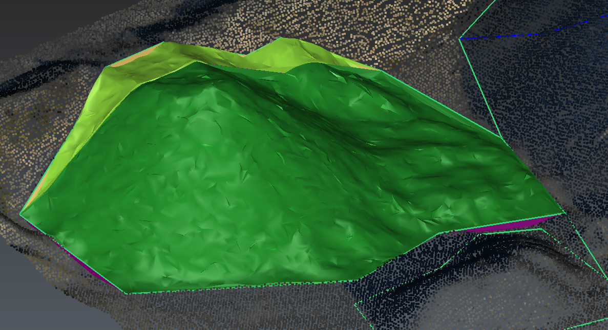 Select the Best plane from contour method to mesh the initial ground below the stockpile. Click Preview. You can use the bulbs to display/hide elements (this can help to find out the best computation method for the ground). Here, you don't have to apply a spike elimination. Click Reset to start again the stockpile contour, if necessary.