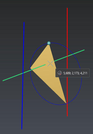 Therefore, when the software is waiting for a point, you will see, next to the cursor, the coordinates of the selected point and an icon showing which snapping it is. If the point is not just behind the cursor, you will also see a small ball in order to locate the point. For example, in this following picture the current point is (5.689, -2.173, 4.211) and is located on the top vertex of the triangle.