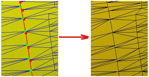 Merging of parallel borders allows to fill "thin" holes with interlaced points. Such contours often come from CAD surface meshing. To fill this type of contour, the system modifies the mesh locally.
