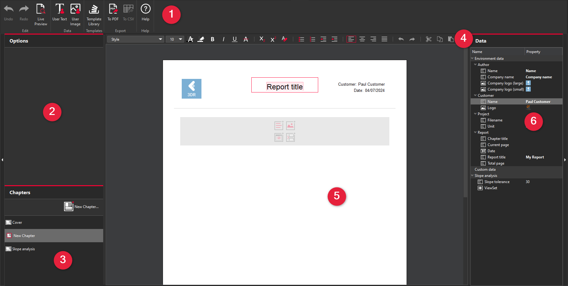 The report editor is divided into 6 areas: