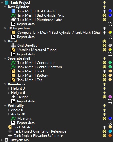 ![]() | This module is designed to do measurements on tank meshes only. Before using it, it is mandatory to clean the original 3D point cloud and to mesh it using other functions. The tank mesh must be oriented so that its long axis corresponds to Z axis. If it is not the case you can use a local CS, however, you will not comply API653. Once a mesh of a tank created or imported, you will have to first create a project to initialize the workflow. This will create a new folder in the tree explorer that will contain the mesh to work on, and other information defined in the project. It will also create a new element not visible in the 3D scene: Tank Infos. This element can be considered as a property sheet that will be filled up all along the workflow to contain definitions, results... etc. Each command will store its results in a dedicated subfolder in the main project folder, and will complete the Tank Infos element. Do not rename, or move manually the elements created by a tank plugin command. |