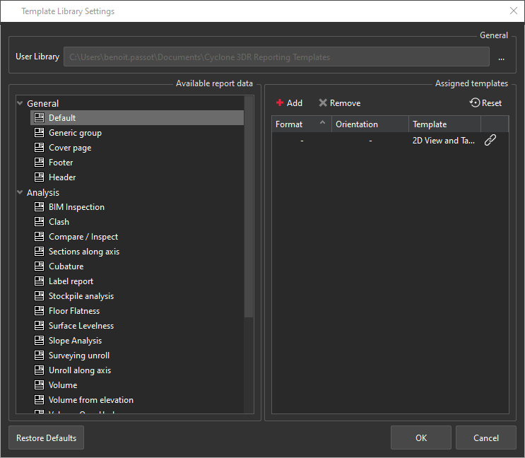 The goal of the template library settings dialog box is to configure the default templates for each report data category: