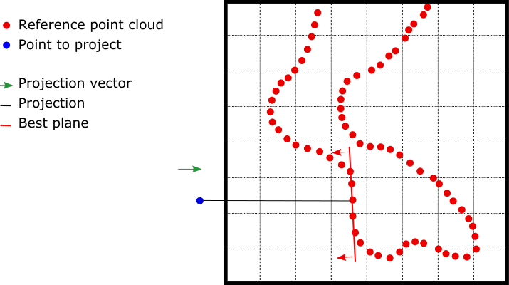 Each point is projected in the direction of the local normal of the cloud on a local plane. In other words, the "distance" is not the closest distance to a point of the target cloud, but the closest distance to a local plane of the target cloud. According to the different options, this local plane is selected as detailed below:
