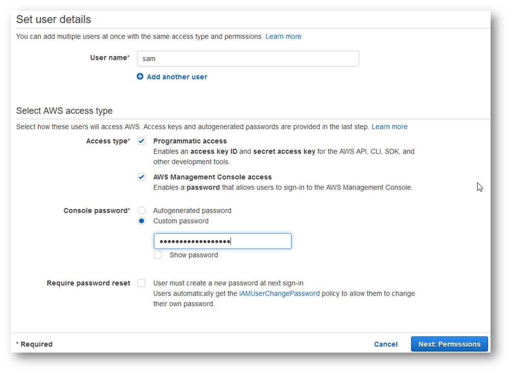Select both Programmatic access and AWS Management Console access.