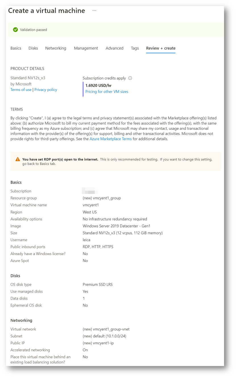 Click “Review + create”. After a few moments, the summary page will be shown stating that the VM settings passed validation.