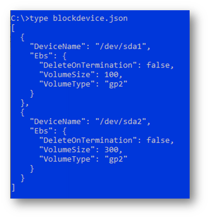 { "DeviceName": "/dev/sda1", "Ebs": { "DeleteOnTermination": false, "VolumeSize": 100, "VolumeType": "gp2" } }, { "DeviceName": "/dev/sda2", "Ebs": { "DeleteOnTermination": false, "VolumeSize": 300, "VolumeType": "gp2" } }