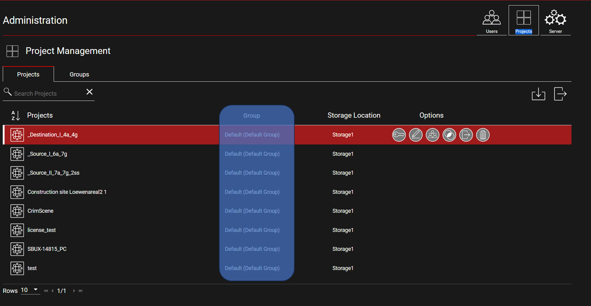 The Project’s Group assignment is displayed in the Administration | Project Management | Projects tab for easy identification and modification.