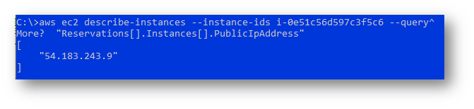 ws ec2 describe-instances --instance-ids <InstanceId> --query "Reservations[].Instances[].PublicIpAddress"