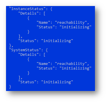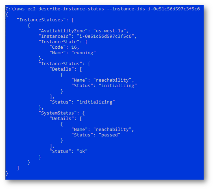 After a few minutes, run the following command to check the status of your EC2 instance.