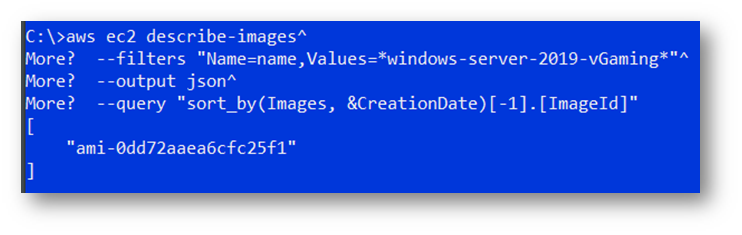 aws ec2 describe-images --filters "Name=name,Values=*windows-server-2019-vGaming*" --output json --query "sort_by(Images, &CreationDate)[-1].[ImageId]"
