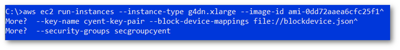 aws ec2 run-instances --instance-type g4dn.2xlarge --image-id <AMI ID> --key-name cyent-key-pair --block-device-mappings file://blockdevice.json --security-groups secgroupcyent