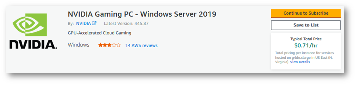 Note: Verify that the Software/hr prices are all zero. The Windows Server 2019 with NVIDIA Driver AMI is provided at no cost. However, you are still responsible for AWS charges for all AWS resources used.